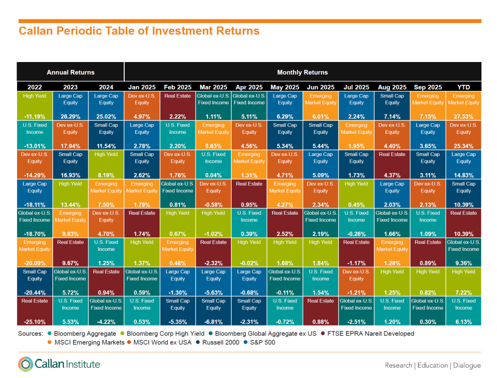 Please find attached the Callan Periodic Table of Investment Returns for the past three years ending December 2024 and year to date as of September 2025. This table visually represents the returns from most public asset classes available to investors with many represented in Callan Family Office client portfolios. The returns are ranked annually from best (top of table) to worst (bottom).